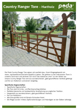 Die Poda Country Ranger Tore eignen sich perfekt dazu, Ihrem Eingangsbereich ein neues, repräsentatives Erscheinungsbild zu geben. Sie gehören zu den exklusivsten Toren in unserem Sortiment und zeichnen sich durch das klassische „Horn“ an den Seiten aus. Unsere Country Ranger Tore sind aus wunderschönem, glatt geschliffenen Hartholz gefertigt und frei von Astlöchern und extrem langlebig.