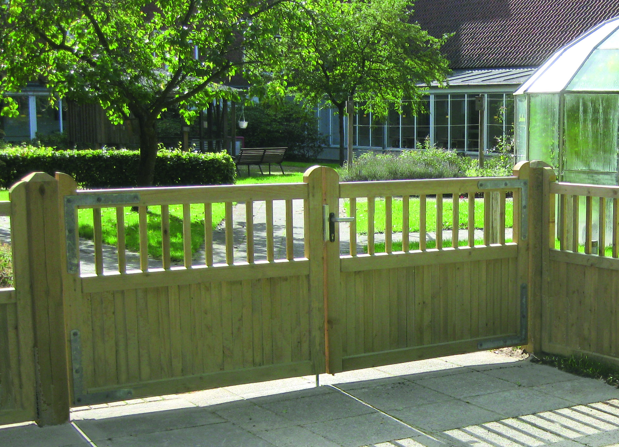 Alle Holzteile des TerndrupZauns sind druckimprägniert. Die Staketen selbst bestehen aus hochwertigen, halbrunden Kiefernlatten mit den Maßen 25 x 80 mm, die mit den 25 x 70 mm großen Querriegeln verbunden sind.